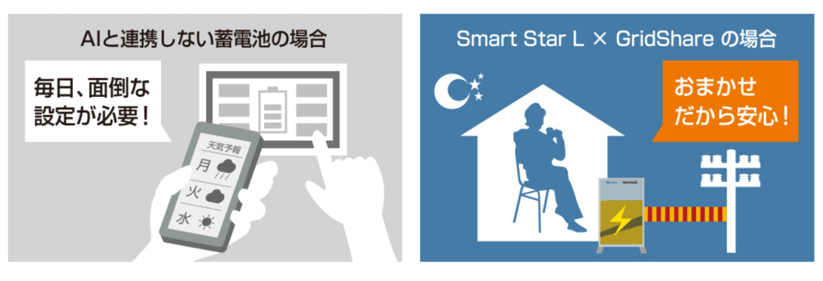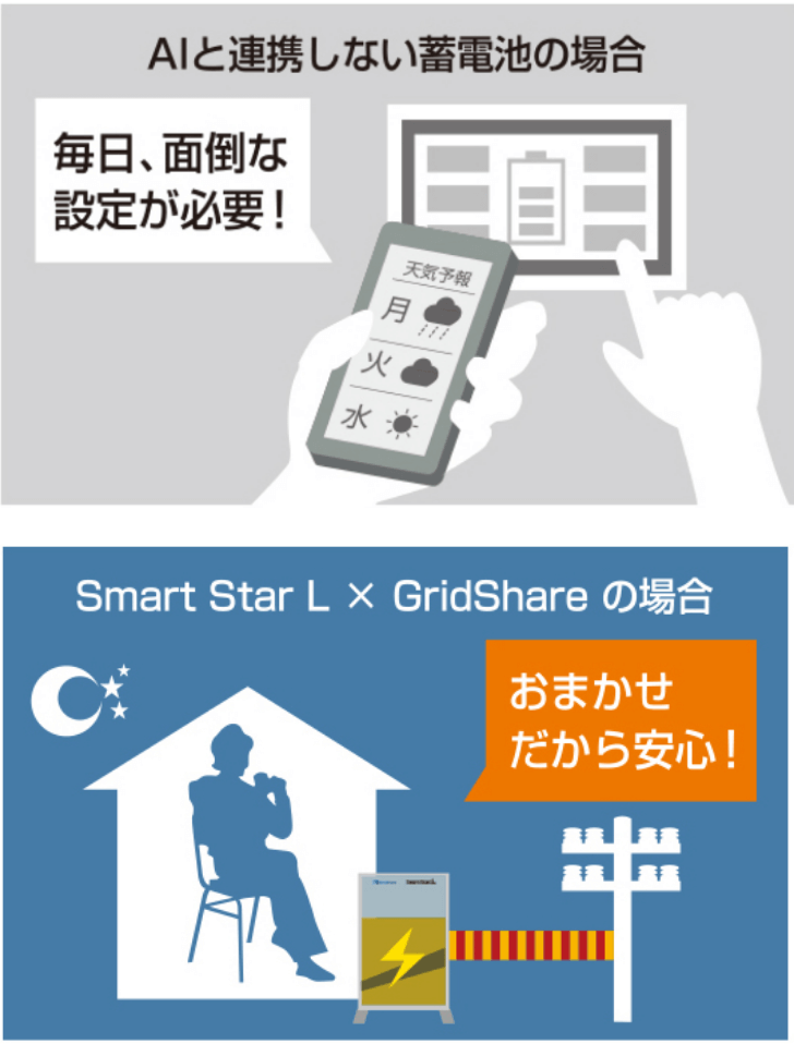 「Smart Star」とAI(人工知能)「GridShare」が連携して日々の電気の使われ方を学習して曜日や時間帯ごとの傾向から、翌日に必要な電力量を予測。翌日の気象予報から、太陽光パネルによる発電量を予測し、AIが予測する翌日の電気使用量と照らし合わせて蓄電池にためる深夜電力を決定します。「GridShare」により蓄電池の充放電を最適コントロールすることで、経済的で安心なエネルギーライフを実現します。