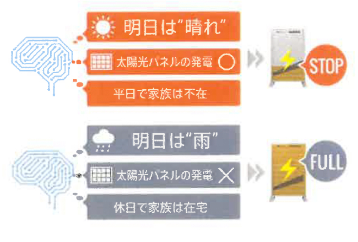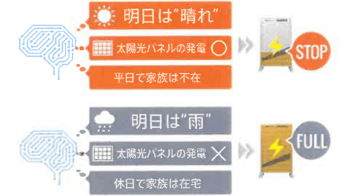 「GridShare」は、翌日の天気予報から太陽光パネルによる発電量を予測します。AIが予測した翌日の電気使用量と照らし合わせて蓄電池にためる深夜電力を決定します。